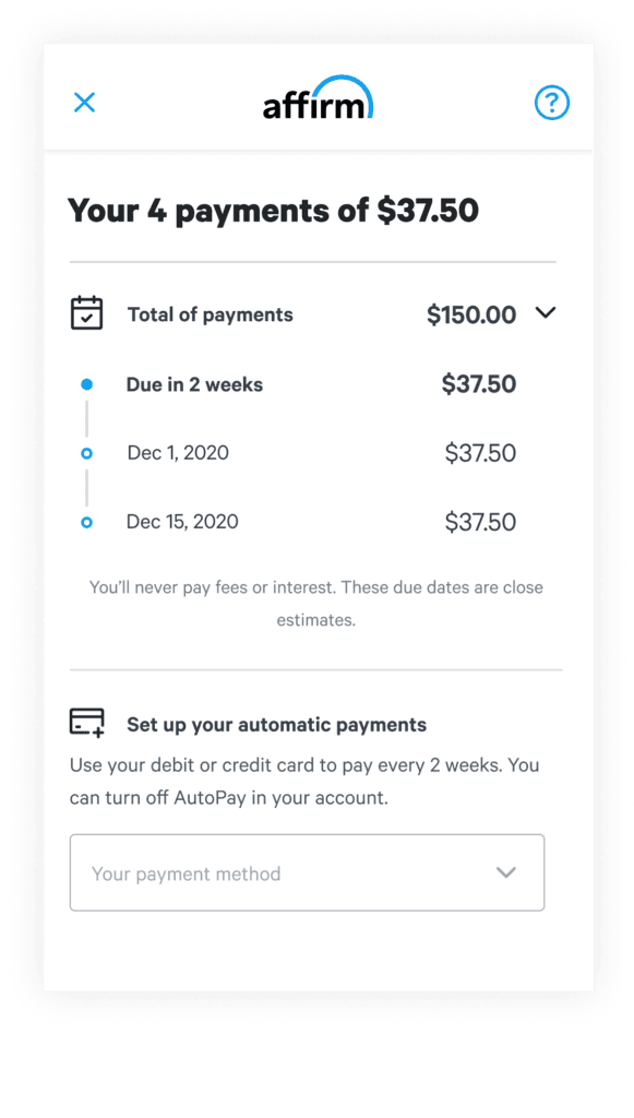 Loans are made or arranged pursuant to California Financing Law. Affirm Inc NMLS ID 1883087. Confirm or change your billing address.